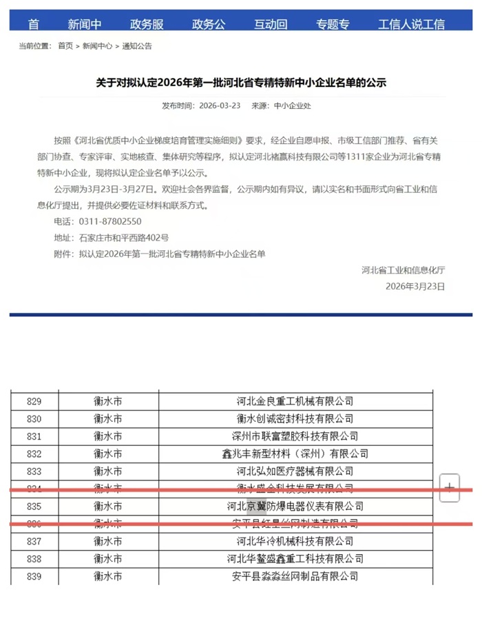 - 2026-03-23喜报! 公司入选2026年第一批河北省专精特新中小企业公示名单